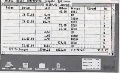 Beispiel: Es sind die Funktionstasten für „Gruppe“ belegt, und im Eingabefenster wird daraufhin im Feld Gruppe nicht das Textkürzel manuell per Tastatur eingegeben, sondern eine Funktionstaste gedrückt, dann fließen einige Angaben dieses Buchungssatzes (Betrag, ob Soll oder Haben, ob Zahlung in bar, per Scheck oder Überweisung) in eine Liste für spätere Auswertungen. Diese Angaben werden nun aufgrund der Zuordnung dieser einen Funktionstaste für alle Buchungssätze in dieser Liste zusammengefaßt. So läßt sich leicht eine rechnerische Zusammenstellung für eine Gruppenangabe erreichen.