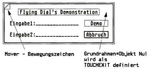 Nun wird bei Anklicken des Grundrahmens, sofern kein anderes Objekt darüber liegt, die FORM_DO-Verarbeitung abgebrochen, und man kann in seine selbstdefinierte Verschiebeprozedur verzweigen und nach Erledigung der Bewegung in die Dialogverarbeitung zurückkehren. Um nur das Bewegungszeichen (MOVER) abzufragen, muß man eine Koordinatenüberprüfung, die den zulässigen Bereich einschränkt, durchführen.