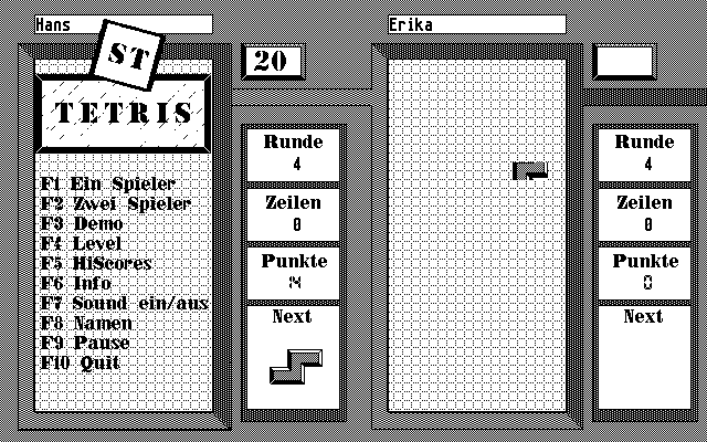 Der Programmautor, Martin Steen, hat sich bei seinem ST_TETRIS allerdings viel Mühe gegeben, daß man seine Umsetzung von anderen unterscheiden kann, weshalb ein kleiner Artikel darüber gerechtfertigt erscheint. Für den Computerneuling, der mit der Bezeichnung und dem Spielprinzip von TETRIS noch nichts anfangen kann, hält diese Version eine Besonderheit bereit: über die Funktionstaste 3 kann man eine Demonstration quasi als animierte Bedienungsanleitung abrufen. Darüber hinaus bietet es als eines der wenigen Programme die Möglichkeit, zu zweit gleichzeitig in zwei Feldern zu spielen. Dazu steht dem einen Spieler die Tastatur mit den Pfeiltasten zur Verfügung, während der andere per Joystick dabei ist. Wer ein bißchen Streß braucht, kann aber auch versuchen, allein beide Felder im Auge zu behalten und simultan zu bedienen. Solange die Steine nicht zu schnell kommen, ist das keine völlig unmögliche Aufgabe.