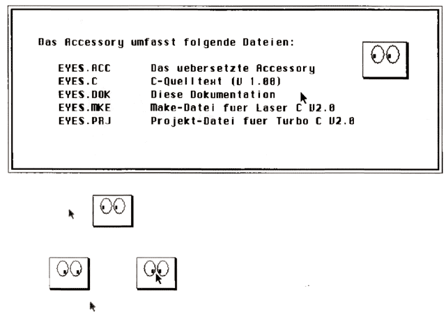 Daß Programmieren nicht immer eine bieremste Angelegenheit sein muß, beweist einmal mehr Peter Kirchgessner mit seinem Accessory EYES (ST-PD # 436): ein lustiges Augenpaar verfolgt neugierig den Mauszeiger über den Bildschirm.
