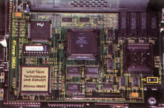 Diese Entwicklung ist nicht zuletzt dadurch zu begründen, daß Intels 80286-Prozessoren zu Spottpreisen zu haben sind. Ein wenig Logik drumherumgestrickt, in den ST eingebaut und mit der nötigen Treiber-Software versehen, schon ist der AT-kompatible ST fertig. Neu ist allerdings ein Emulator, der auf dem schnellen 32-Bit-Prozessor 80386SX basiert. Auch hier hat sich nun ein erstes Gerät marktreif eingefunden. Die Firma Vortex, früher bekannt durch ihre Festplattenserie für den ATARI-ST, hat nach ihrem AT-Emulator ATonce, der noch den 80286 benutzt, einen weiteren MS-DOS Emulator, den ATonce 386SX, entwickelt und erstmals auf der ATARI-Messe in Düsseldorf der breiten Öffentlichkeit präsentiert. Wie der Name schon erkennen läßt, werkelt auf der Zusatzkarte ein Intel 80386SX-Prozessor, der mit 16 MHz getaktet wird. Das uns zur Verfügung gestellte Gerät ist allerdings nur in Computern der Mega-STE-Serie ersetzbar. Inzwischen hat Vortex auch eine Version angekündigt, die in allen ST-Modellen lauffähig sein soll. Zum Erscheinungstermin dieser Ausgabe der STCOMPUTER sollte dieses Gerät bereits im Handel sein.