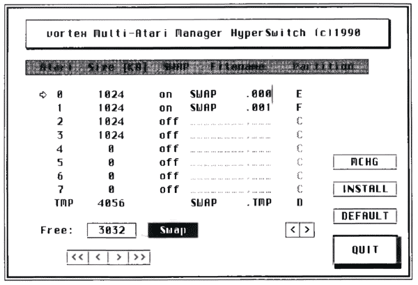 Quasi als Zugabe hat Vortex noch ein Programm entwickelt, das sich Hyper-Switch (Abb.3) nennt. Wie der Name vermuten läßt, handelt es sich hierbei um einen Programm-Switcher. Als Accessory installiert, kann es den Mega-STE in 8 STs aufteilen, welche völlig unabhängig voneinander arbeiten und konfiguriert werden können. Wahlweise kann der vorhandene RAM-Speicher zum Switching benutzt werden, wobei er sich dann auf die 8 installierten Geräte aufteilt, oder es wird jeweils beim Umschalten der komplette Speicher auf Festplatte ausgelagert. Das Bonbon bei der Sache ist aber, daß auf einem oder mehreren solcher „virtuellen STs“ ATonce 386SX gestartet werden kann. Per Tastendruck kann man dann einfach zwischen DOS und TOS umschalten, ohne daß irgend ein Programm dabei verlassen werden muß. Eine theoretische Kombination wäre zum Beispiel: 3 virtuelle STs mit jeweils 4 Megabyte RAM, auf dem ersten läuft Calamus, auf dem zweiten Word für Windows unter ATonce, und der dritte beherbergt den Turbo C-Editor für MS-DOS. Natürlich kann immer nur eine Anwendung gleichzeitig Rechenzeit beanspruchen. Alle anderen befinden sich im eingefrorenen Zustand auf der Festplatte. Eine schnelle Festplatte sollte man dafür allerdings schon besitzen. Vier Megabyte speichern und anschließend wieder laden kostet seine Zeit. Außerdem wird genügend freier Speicherplatz auf der Platte benötigt; wer wirklich 8 virtuelle STs mit jeweils 4 Megabyte Speicher installieren will, muß also 32 Megabyte Festplattenkapazität reservieren. Glücklicherweise kann man diesen Platz über mehrere Partitionen verteilen. Der Switcher funktioniert übrigens auch ohne ATonce.
