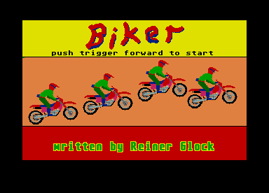 Im Straßenverkehr dürfen Sie sich so nicht erwischen lassen: Von Ihrem Joystick gesteuert donnern Sie mit einer starken Enduro-Maschine durch eine kleine Stadt, vorbei an Bar, Hotel und Waschstraße. Dort haben Sie allerdings weniger die Pixelpolizei zu fürchten als die Hindernisse und Überraschungen, die Reiner Glock dort eingebaut hat (ST-PD 290).