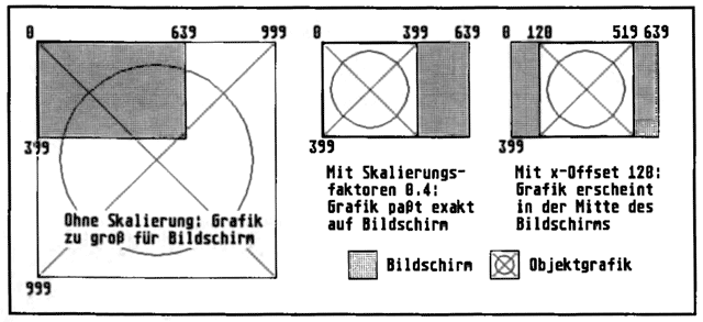 Jede Darstellung auf dem Bildschirm -bei Calamus etc. erfolgt dies in GEM-Fenstem - ist deshalb nur eine Projektion, eine Visualisierung dieser Objekte. Die Ausgangsdaten, also die Koordinaten, Längen und Radien, welche die Objekte beschreiben, bleiben dabei unverändert, und zwar unabhängig von der gewählten Größe, in der die Grafik auf dem Monitor zu sehen sein soll. Hierzu wird nämlich bei der Ausgabe eine Skalierung vorgenommen, d.h. sämtliche Objektdaten für x- und y-Richtung werden mit zwei Faktoren, den Skalierungsfaktoren, multipliziert, welche bei richtiger Berechnung genau die gewünschte Ausdehnung der Grafik bewirken. Wünscht der Benutzer nun die Grafik in doppelter Größe zu sehen, so werden die Skalierungsfaktoren neu berechnet (in diesem Fall mal 2 genommen) und die Grafik erneut gezeichnet. Was nicht auf den Bildschirm bzw. ins Fenster paßt, wird weggeclippt.