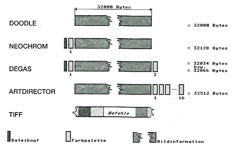 Kurz darauf kam das Programm NEOCHROM auf den Markt, das zwar auch den Inhalt des Bildschirmspeichers direkt, aber zusätzlich noch eine 32-Byte-Farbpalette festhielt. NEOCHROM konnte nur die niedrigste Auflösungsstufe darstellen. Dann kam DEGAS, was neben einer zweiten Farbpalette für einfachste Animationen auch alle drei Auflösungsstufen bediente. In dem Programm ARTDIRECTOR beispielsweise standen schließlich 16 Farbpaletten für etwas ausgefeiltere Animationen, allerdings auch nur in der niedrigsten Auflösung, zu Verfügung. Sehr schön werden diese Zusammenhänge aus der Anfangszeit der Grafikformate in [6] beschrieben. Nachforschungen bei großen und bekannten Verlagen haben ergeben. daß sich Bücher zur Grafik Programmierung für den ST leider über die Grafikformate weitestgehend ausschweigen.