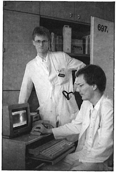 Abb. 4: Dr. Dettmann (rechts) und der Autor (links) bei der Datensuche im Tumorregister des Großrechners mit dem ST als Terminal