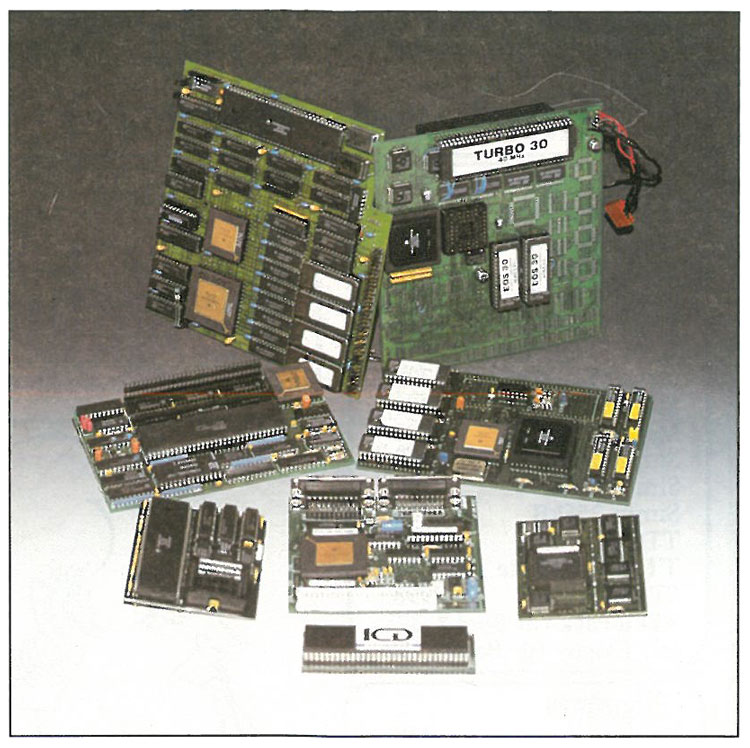 Ausnahmslos alle Beschleunigerkarten werden anstelle des Originalprozessors eingesetzt. Dieser muß also zuvor entfernt und durch einen Sockel ersetzt werden. Leider ist dies die einzige Möglichkeit, solche Erweiterungen einzusetzen, da verständlicherweise nicht zwei Prozessoren gleichzeitig auf die restliche Hardware des Computers zugreifen können. Bei der hardwaremäßigen Realisierung der Cache-Abschaltung scheiden sich aber dann die Geister. Populär ist die Methode, ein nicht benutztes Bit des im Soundchip enthaltenen I/O-Ports als Umschaltimpuls zu benutzen. Dazu muß der Anwender allerdings ein zusätzliches Kabel vom Soundchip zum Turbo-Board ziehen. Dies geht nicht ohne Lötarbeit ab und verhindert zudem den raschen Ausbau des Gerätes. Andere Hersteller bewerkstelligen dies auf eine andere Art und Weise. Ein zusätzliches Kabel wird dabei nicht benötigt. Allerdings ist dann für den Anwender nicht dokumentiert, wie er die Umschaltung aus eigenen Programmen selbst vornehmen kann. Schließlich gibt es auch noch die „brutale“ Methode, den Cache über einen ganz gewöhnlichen Schalter ein- und auszuschalten. Dies mag vielleicht ganz praktisch sein, jedoch hat es sich gezeigt, daß das Prellen eines solchen Schalters fast immer einen Absturz des Systems nach sich zieht.
