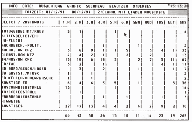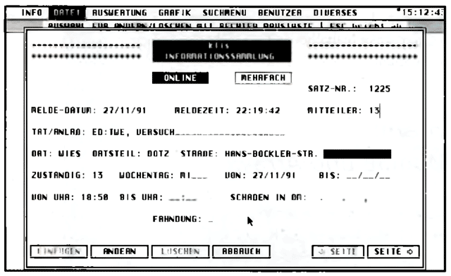 Stichwort Kontrolle: schon bald stellten wir fest, daß Eingabefehler die Auswertungsergebnisse in nicht tolerierbaren Ausmaßen verfälschten. Da wurde z.B. der gestrige Raub nicht mehr gefunden, weil er mit einem führenden Blank eingegeben worden war, oder eine ZK-Nummer (Nummer der Anzeige) fehlte plötzlich, weil die Jahreszahl versehentlich 92 statt 91 lautete. Eine zusätzliche Routine sorgt inzwischen dafür, daß vor dem Einfügen eine ganze Batterie von Plausibilitätskontrollen durchlaufen wird, die Fehler bei den auswertungsrelevanten Feldern vermeidet.