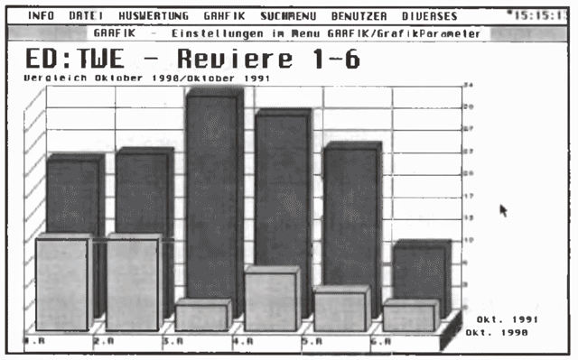 Auch der Lagedienst kann auf Grafik als Unterstützung der schriftlichen Lagedarstellung nicht verzichten. Sehr gut eignet sich z.B. Grafik beim Vergleich der Deliktsentwicklung verschiedener Zeiträume und/oder verschiedener Ortsbereiche. Dazu bietet klis die Möglichkeit, die Werte von Auswertungen oder Auswertungsvergleichen in die Präsentationsgrafik zu übernehmen. Es genügt, in der Auswertungsmatrix Spalten oder Zeilen anzuklicken. Die Gestaltung komplexerer Grafiken ist über das Grafikmenü möglich (siehe Bild 5). Bis zu vier Reihen mit je 12 Einzelwerten können dargestellt werden. Die Folge der Reihen ist beliebig -auch nachträglich - veränderbar sinnvoll bei 3D-Säulen, die sich gegenseitig verdecken können). Einzelwerte können ein oder ausgeblendet werden. Als 3D-Darstellungen sind Säulen, Blöcke und Torten, als 2D-Darstellung Balken und Linien verfügbar.