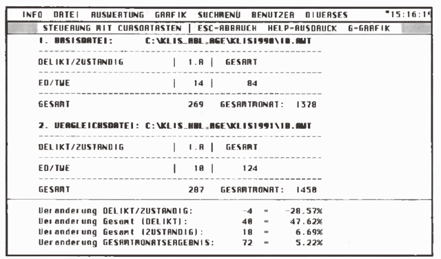 Statistik wurde bei der Entwicklung von klis kleingeschrieben. Die Ursache liegt nicht etwa darin, daß trockenes Zahlenmaterial für Veröffentlichungen wenig geeignet ist. sondern in der Institution der PKS (Polizeiliche Kriminalitäts-Statistik). Diese wird ohnehin von den Polizeibehörden aufgrund gesetzlicher Vorschriften geführt, klis bietet daher nur den sogenannten Auswertungsvergleich an. In dieser Funktion lassen sich Auswertungsdateien, wie sie auf Wunsch im Rahmen einer Auswertung erzeugt werden, vergleichen. Der Vergleich ist als Gesamt- oder Einzelvergleich möglich. Im Gesamtvergleich werden alle Zeilen- und Spaltenwerte der Auswertungsdateien eines Jahres automatisch geladen und summiert mit Minima und Maxima dargestellt. Im Einzelvergleich können zwei beliebige Auswertungsdateien gegeneinander verglichen werden. Dabei scrollen die Werte beider Tabellen synchron in jede gewünschte Richtung: darunter werden die prozentualen Abweichungen angezeigt (siehe Bild 7). Wie bei der Auswertungsmatrix lassen sich die Werte an die Präsentationsgrafik übergeben.