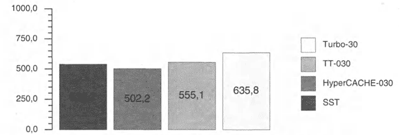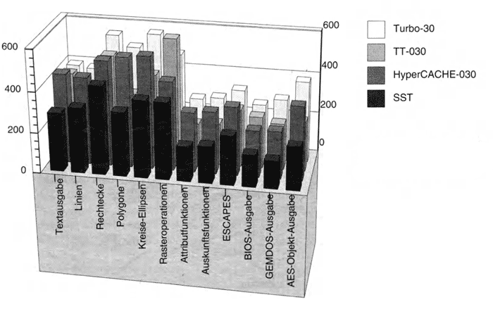 Erstaunlich ist, daß die Ergebnisse bei Grafikausgaben ohne NVDI weit hinter denen vergleichbarer Beschleunigerkarten Zurückbleiben. Hier macht sich der fehlende Cache doch negativ bemerkbar. Auch scheint man auf ein besonders schnelles Zugriffsverfahren auf das Betriebssystem im ROM (wie es fast alle anderen Hersteller verwenden) verzichtet zu haben. Das Betriebssystem ist beim SST auch lediglich 16-Bit breit organisiert (wohl, um direkt die ATARI-ROMs bzw. EPROMs einsetzen zu können). Hier hätte man also noch einiges an Performance gewinnen können. Mit NVDI (das ja ins schnelle Fast-RAM geladen werden kann) sind die Ergebnisse wesentlich besser.