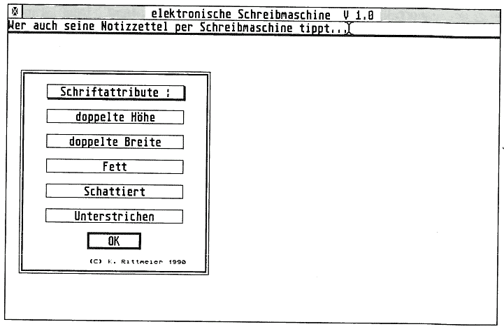 Die Schreibmaschine lÀuft in einem normalen GEM-Fenster (oberer Bildteil). Es lassen sich auch Attribute einstellen (Info-Kasten).