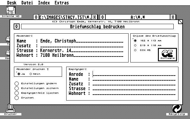 Eine sinnvolle Ergänzung zur Textverarbeitung: Umschlagdruck Eine sinnvolle Ergänzung von Textverarbeitungsprogrammen stammt von Christoph Emde: es ist ein kleines, aber feines Accessory zum Bedrucken von Briefumschlägen. In einem großen Dialogfenster lassen sich Absender und Anschrift eintragen sowie verschiedene Umschlaggrößen zwischen DIN C6 und DIN A5 wählen. Außerdem kann der Ausdruck des Absenders abgeschaltet werden. Auf Wunsch lassen sich diese Grundeinstellungen auch abspeichem. Leider wird diese Datei bei jedem Aufruf nachgeladen, so daß es u. U. zu Verwirrungen oder Abstürzen nach einem Diskettenwechsel kommen kann. Die Anwahl der unterschiedlichen Umschlaggrößen wirkt sich in erster Linie auf die Positionierung der Textfelder auf dem Umschlag aus. Bei dem großen Format wird allerdings auch eine größere Schrift verwendet, leider mit etwas zu knappen Zeilenabstand. Insgesamt ist das Accessory aber eine gute Idee, die man noch für weitere Zwischendurchtexte ausbauen könnte: Scheckvordrucke, Absenderaufkleber, Warnetiketten. thl Briefumschlag ST-PD 265