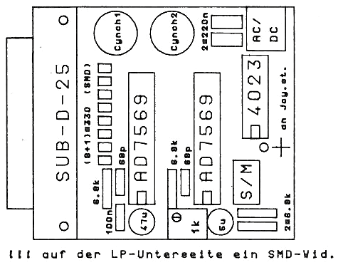 Die Widerstände zwischen den Datenleitungen und dem Sub-D-Stecker haben die Aufgabe, bei falscher Programmierung des Drucker-Ports einen Kurzschluß zu verhindern. Der Strom wird so im Fall des Falles auf ca. 10mA begrenzt. Dabei wird zwar die Umsetzzeit (oder korrekter die Datenübertragungszeit > T=R*C, wobei C die Eingangskapazität des Drucker-Ports ist) etwas größer, doch ist es nicht einmal einem TT möglich, die noch bestehende Geschwindigkeit des Samplers zu erreichen. Das Strobe-Signal ist in der gleichen Weise geschützt, wobei dieser Widerstand bei einem richtigen Aufbau der Platine nicht notwendig ist.