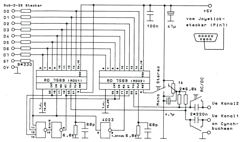 Die Betriebsspannung des AD7569 beträgt 5 V und kann aus der Joystick-Buchse gewonnen werden. Der Betrieb mit einer symmetrischen Betriebsspannung (+-5 V) ist auch möglich. Dabei kann der Spannungsteiler zur Arbeitspunkteinstellung entfallen.