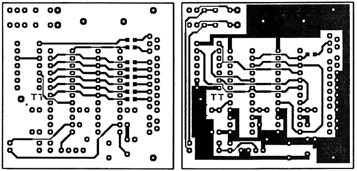 Die Schaltung wird auf einer zweiseitig beschichteten Leiterplatte der Größe 60*53 aufgebaut. Die Breite 53mm entsteht durch die Sub-D-Steckerleistenbreite. Der Schwierigkeitsgrad ist für den Handzeichner recht hoch, da einige Leitungen zwischen den Anschlüssen der Schaltkreise durchgeführt werden müssen. Deshalb sollte man sich eher an Fachleute halten, die den fotochemischen Weg durchführen können. Dabei wird eine mit Fotolack beschichtete Leiterplatte mit einer Maske belichtet und danach fixiert und geätzt. Die Maske kann eine Zeichnung auf Transparent sein, die man z.B. durch einen Plotter oder einem Tintenstrahldrucker erhält.