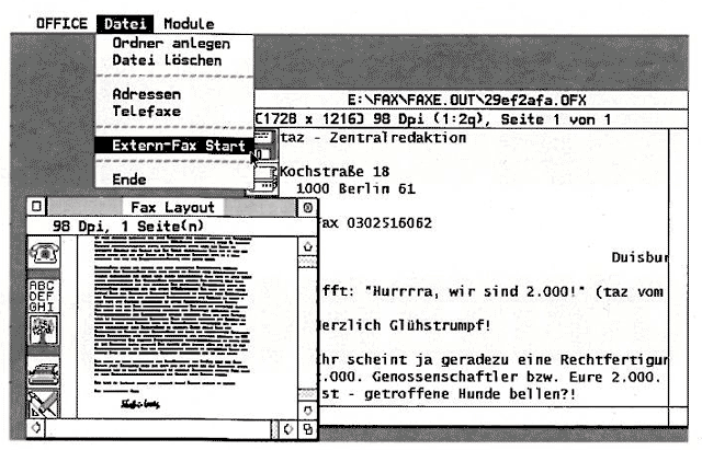 Wirklich neu ist an Tele-Office die Option Extern Fax, die es ermöglicht, ähnlich wie bei QFax die Erstellung von Faxen anderen Programmen und deren Druckoption zu überlassen, während das eigentliche Faxprogramm sich lediglich um die Adressierung und den Versand kümmert. Es sind somit gerade aus Programmen, die mit Grafikdruckerzeichensätzen arbeiten (etwa CyPress oder Script) bzw. gänzlich auf Grafik setzen (Calamus) weit bessere Ausgabequalitäten als durch die Tele-Office-eigene ASCII-Konvert-Routine erzielbar. Die Möglichkeiten zu Proportionalschrift, frei skalierbaren Fonts und verschiedenen Schriften und Schnitten lassen das FaxerInnen-Herz höher schlagen. Der Weg dorthin ist verhältnismäßig einfach: Man lädt Tele Office als Accessory, startet das Textverarbeitungsprogramm, erstellt das Fax, gibt Tele-Office das Startzeichen, 'druckt’ mit einem speziellen Treiber auf Diskette bzw. Festplatte, gibt TeleOffice das Stopzeichen und ab geht das Fax. Diese speziellen Treiber jedoch stellen noch den Schwachpunkt dieses Systems dar: Es müssen speziell auf die Faxerstellung zugeschnittene Treiber sein.