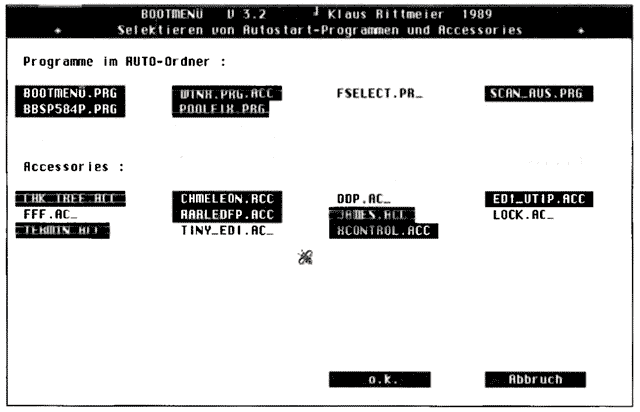 Damit man nicht mühselig von Hand jeweils alle betroffenen Programme außer Gefecht setzen muß, hat Klaus Rittmeier das Programm BOOTMENÜ entwickelt (ST-PD # 327). Wenn es als physikalisch erstes Programm im Auto-Ordner steht, listet es nach einem Reset alle im Auto-Ordner befindlichen Programme und im Wurzel Verzeichnis vermerkten Accessories tabellarisch auf. Aktive Programme sind dabei durch einen schwarzen Balken hervorgehoben. Durch einen simplen Mausklick kann man nun die gewünschten Programme an- und ausschalten. Erst nach einem Klick auf OK oder durch die RETURN-Taste wird der Boot-Vorgang fortgesetzt und die Anwendungen installiert. Allerdings muß man bei den Accessories selbst auf die Höchstzahl von sechs achten.