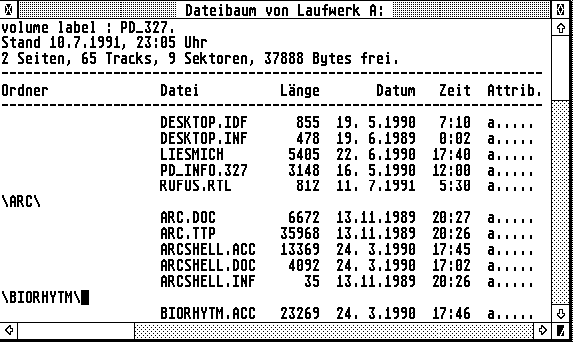 Die große Stärke dieses Editors liegt m. E. in einer ganz anderen Funktion, die leider noch nicht einmal im Hilfe-Menü des Editors aufgeführt wird: mit der Tastenkombination Alternate-Laufwerkskennung läßt sich der gesamte Dateibaum des Laufwerks einlesen. Dabei werden sämtliche Ordner geöffnet sowie Länge, Datum, Zeit und die Dateiattribute (versteckt, System etc.) angezeigt. Gleichzeitig bekommt man eine Grundinformation über das Diskettenformat. Am Anfang der Auflistung werden automatisch Uhrzeit und Datum eingefügt, so daß man später die Liste zeitlich genau einordnen kann.
