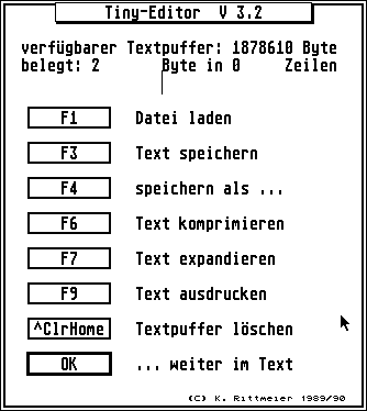 Der kleine Texteditor von Klaus Rittmeier ist als Accessory für den Zwischendurchgebrauch konzipiert (ST-PD #327). So läuft das Programm in einem Fenster und bietet nur die nötigsten Funktionen, um den RAM-Speicher nicht unnötig zu belasten. Weil die Bildschirmausgabe über normale VDI-Funktionen abgewickelt wird, arbeitet sie ziemlich träge. Vor allem bei Texten, die länger als 100 Zeilen sind, macht sich das schnell bemerkbar. Das Haupteinsatzgebiet liegt deshalb wohl eher bei kleineren Aktionen, wie direkten Änderungen an der DESKTOP.-INF oder ähnlichen Dingen.