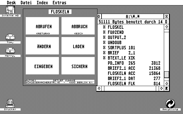 Eine Möglichkeit diesem Mangel abzuhelfen, besteht mit dem FLOSKEL-Accessory von Detlef Kuhnke (ST-PD #265). Dieses kleine Programm speichert 17 bis zu 63 Zeichen lange Texte und fügt sie auf Tastendruck in den aktuellen Text einer Text Verarbeitung. eines Editors oder einer Tabellenkalkulation ein. Dabei können nicht nur ASCII-, sondern auch Steuerzeichen verwendet werden. Selbstverständlich können die Texte auch gespeichert oder nachgeladen werden. In einer kleinen Tabelle werden die Texte bzw. deren Anfänge mit der dazugehörenden Taste aufgelistet.