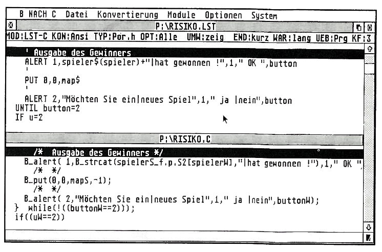 Nun die entscheidende Fragestellung, nämlich nach dem notwendigen Aufwand, um aus dem BASIC-Quelltext ein lauffähiges Äquivalent in C zu erhalten. Der Konverter unterstützt, von wenigen Ausnahmen wie z.B. EVERY/AFTER und RESUME abgesehen, sämtliche Befehle von GFA-BASIC 3.0.