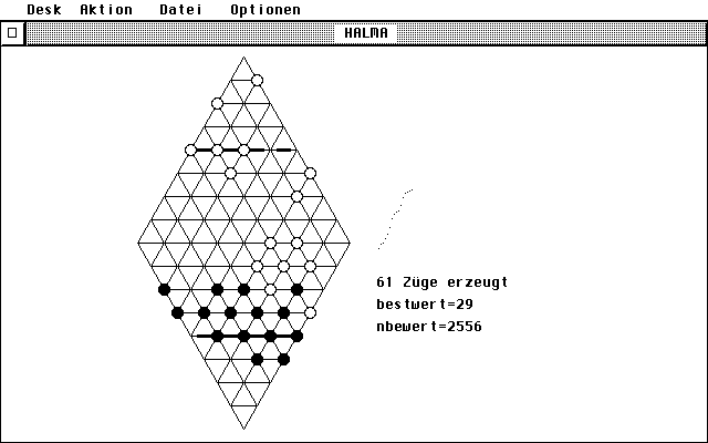 Einziger Kritikpunkt an HALMA ist die Größe des Brettes. Durch die aufrechte Darstellung ist es auf dem Monitor doch ziemlich klein ausgefallen, so daß man schon sehr genau hin schauen und klicken muß. wenn man ziehen möchte. Ein um 90° gedrehtes Brett sollte wenigstens als Alternative zur Verfügung stehen. Dafür ist die Spielstarke des Programmes beachtlich. Es dauert schon einige Zeit, bis man sich als Normalverbraucher einmal gegen die Maschine durchsetzen kann. Leider kann man sich dann nicht wie sonst üblich in eine Siegerliste eintragen.