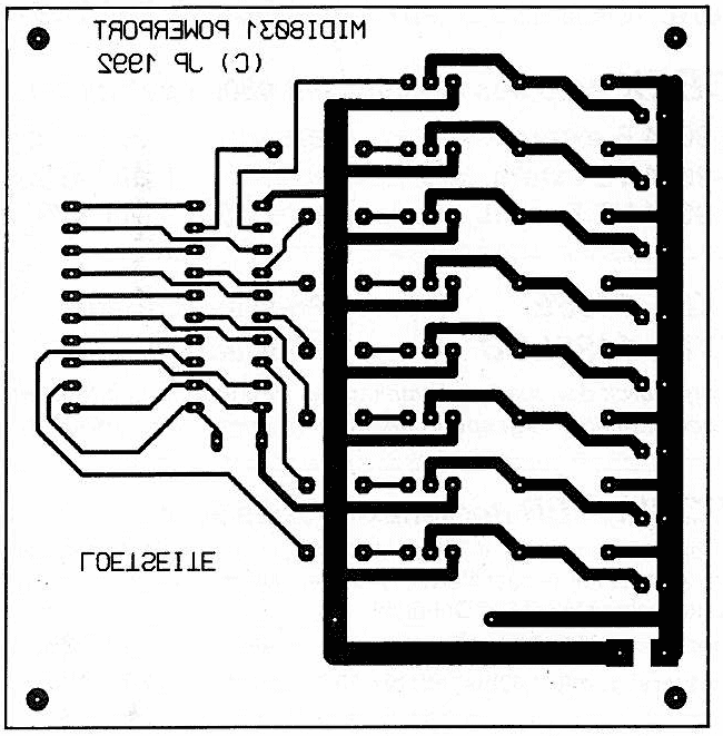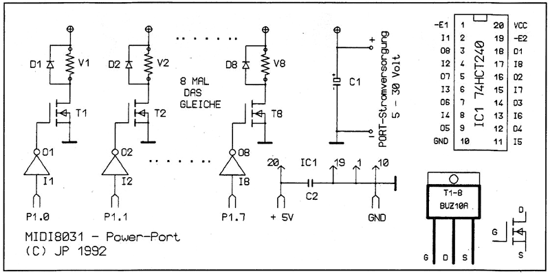Die Schaltung für den Power-Port ist prinzipiell recht einfach: Jedes der 8 Bits von Port 1 des Mikro-Controllers läuft über einen Inverter, dem jeweils ein SIPMOS-Leistungstransistor nachgeschaltet ist. SIPMOS-Transistoren haben nahezu ideale Schalteigenschaften. Sie lassen sich direkt mit den selben logischen Pegeln ansteuern, wie sie auf der MIDI8031-Platine Vorkommen, also zwischen 0 und 5 Volt. Liegt der Steuereingang „G“ auf logisch 0, sperrt der Transistor, bei logisch 1 wirkt er praktisch wie ein Kurzschluß! Der in der Schaltung verwendete BUZ10A kann bis zu 20 Ampere schalten. Parallel zur jeweiligen Last (im Schaltplan V1 - V8) ist eine Diode geschaltet. Mit ihr hat es folgende Bewandtnis: Fließt ein Strom durch eine Spule (wie etwa ein Relais, entsteht ein Magnetfeld. Wird der Stromkreis mit einem Schalter unterbrochen, ist normalerweise ein kräftiger Funke zwischen den Kontakten des Schalters zu beobachten, da beim Zusammenbrechen des Magnetfeldes kurzzeitig hohe Spannungen genau entgegengesetzt zur vorher angelegten Spannung auftre-ten. Diese sogenannte Freilaufspannung würde den Transistor zerstören. Sie kann aber durch eine Diode kurzgeschlossen werden. In der Schaltung wurde der preiswerte Typ 1N4001 verwendet, der zwar kurzzeitig einige Ampere verträgt, aber bei sehr starken Verbrauchern mit Spulen (zum Beispiel großen Elektromotoren) durch einen geeigneteren Typ ersetzt werden sollte. Dabei sollten Sie auch beachten, daß die Kupferbahnen der Platine aufgrund ihrer Breite nur für eine Belastung von insgesamt etwa 5 Ampere ausgelegt sind. Die Schaltfrequenz des Power-Ports ist sehr hoch: sie liegt im Megahertz-Bereich! Aufgrund der Zykluszeit des 80C31 von einer Mikrosekunde lassen sich Lasten mit bis zu 500 Kilohertz schalten.