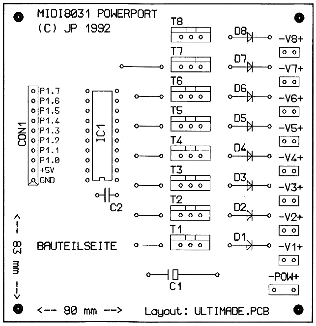 Mikro-Controller steuern und regeln. Dazu müssen sie große Leistungen schalten können. Im letzten Teil des Projektes finden Sie daher eine, im wahrsten Sinne des Wortes, „kräftige“ Schaltung: den MIDI8031-Power-Port. Für etwa 20 DM kann Ihr MIDI8031-Mikro-Controller-System damit bis zu 8 * 20 Ampere schalten!