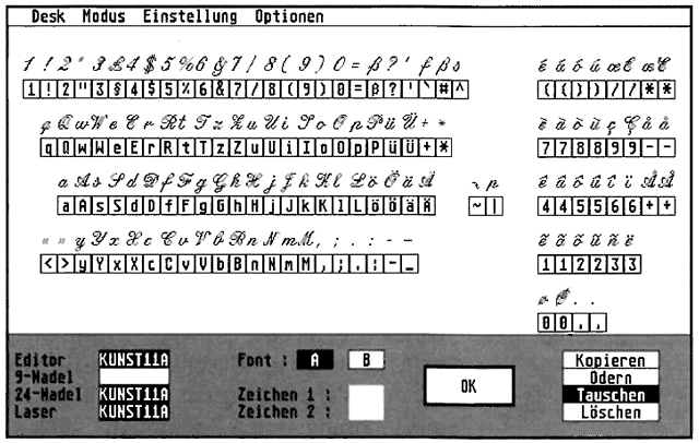 Es lassen sich die Zeichensätze mit ihren wirklichen Bildschirmzeichen darstellen.
