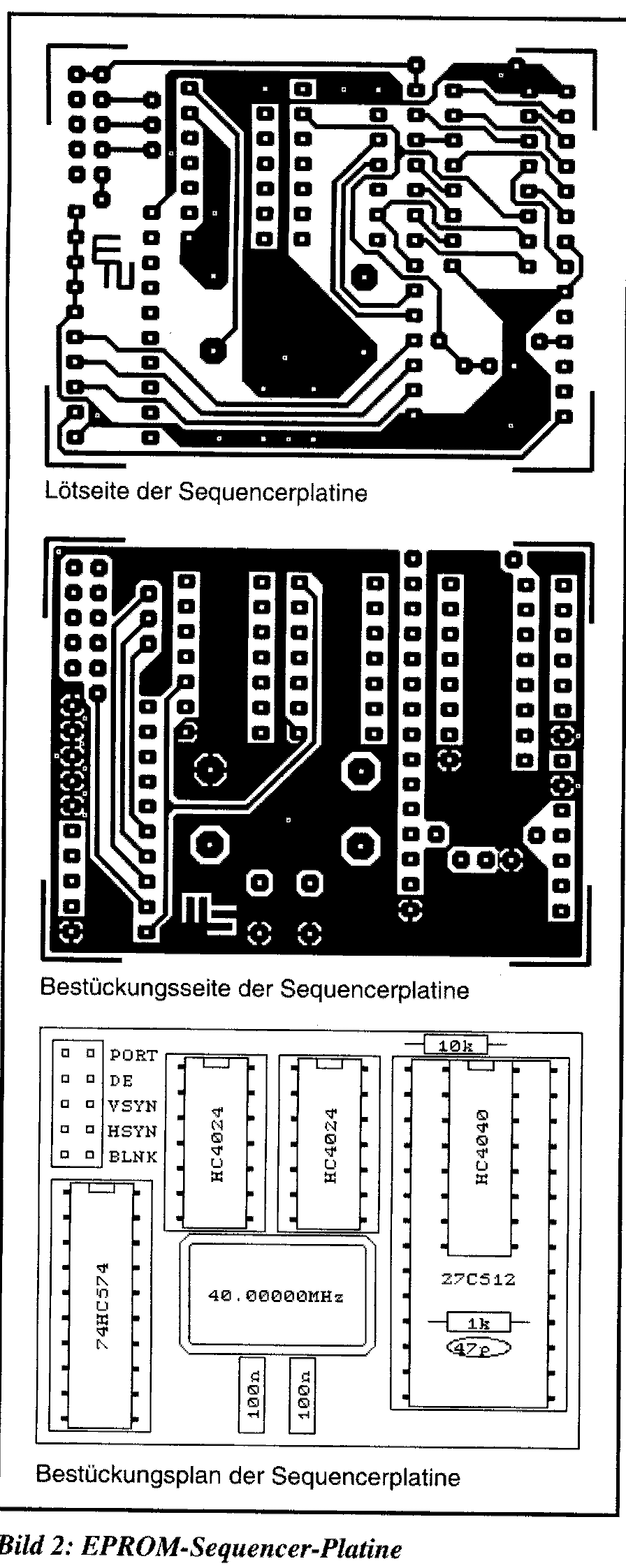 ... für die Versorgung mit mehr Taktfrequenz. Doch halt, die Anpassung der Bildschirmsynchronsignale fehlt noch. Daher müssen Sie zunächst die Leiterplatte nach Bild 2 bestücken. Dabei gelten ganz analoge Aufbauhinweise wie bei der Floppycontroller-Platine (für den Quarzoszillator werden vier Einzel-Pins in entsprechend große Löcher gelötet!). Für die HC(T)Bausteine können die Sockel eingespart werden, man tut sich dann beim beidseitigen Verlöten der wenigen oben geführten Leitungen leichter (der HC4040 unter dem EPROM kann sowieso nicht gesockelt werden wegen der Bauhöhe). Es geht aber auch mit Fassungen mit gedrehten Kontakten. Das EPROM muß aus naheliegenden Gründen auf alle Fälle wechselbar sein. Die Stiftleiste kann aus Gründen der Bauhöhe gewinkelt sein, muß es aber nicht. Vergessen Sie die Durchkontaktierungen daneben nicht!