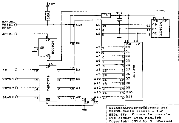 Die Datenleitung D6 kann durch vorzeitigen Reset der Zähler den Zyklus verkürzen, so daß in Verbindung mit geeigneten EPROM-Inhalten fast jedes beliebige Bildschirm-Timing programmierbar ist. Die Adreßleitung A15, von einem freien Port des Soundchips umgeschaltet, wählt zwischen zwei Auflösungen aus. Denkbar, aber bisher nicht getestet, wäre auch ein Auflegen der Monochrom-Detect-Leitung an A 15, um weiterhin alternativ Farbe und Monochrom wie gewohnt zu haben.