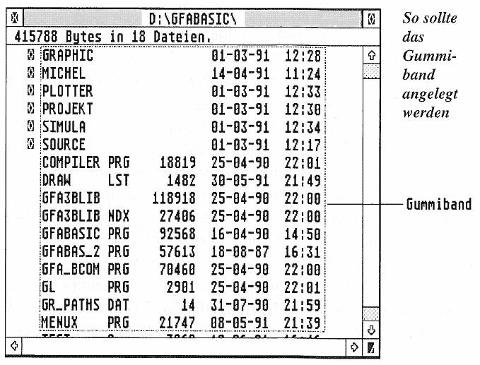 Texthardcopy läuft sowohl als Accessory (in THARDCOP.ACC umbennen) als auch als Programm (THARDCOP.PRG). Das Accessory kann durch Anwählen in der Menüleiste bzw. durch Drücken und Halten der beiden Shift-Tasten für ca. 1 Sekunde gestartet werden. Das Programm kann z.B. von einem CLI gestartet werden, wenn man sich in der TOS-Umgebung bewegt. Die verschiedenen Möglichkeiten sind im Listing nochmal ausführlich dokumentiert. Nach dem Programmstart erscheint zunächst eine Dialogbox, in der die Art des Hardcopy-Textes gewählt werden kann (s.o.). Zusätzlich steht ein „HELP“-Button zur Verfügung. Über diesen kann in das Help/Parameter-Menü verzweigt werden. Dort wird ein kurzer Hilfstext ausgegeben. Zusätzlich kann über den Button „Snap“ ein Grafikausschnitt auf Diskette gespeichert werden (Snapshot-Utility). Über den Zeilenabstand-Button können exotische Zeilenabstände gewählt werden. Dieser Button wird bisher nicht benötigt und ist für die Zukunft reserviert, falls Atari ein anderes Ausgabeformat wählt. Nachdem Sie Ihre Wahl getroffen haben, erscheint die Aufforderung „Bereich wählen“. Sie können nun ein Gummiband aufziehen, das den zu scannenden Textbereich umschließt. Das Gummiband sollte so angelegt werden, daß die Ecken jeweils etwa 5 Pixel vom Textrand entfernt sind. Besonders die Wahl der linken oberen Ecke spielt eine große Rolle, da von hier ausgehend der Textanfang gesucht wird. Als Anhalt kann hier Bild 1 dienen. Nun beginnt der eigentliche Scan-Vorgang. Während das Programm den Textanfang sucht (Meldung „Suche Textanfang“), erscheint in der rechten oberen Ecke ein wachsender Balken. Ist der Textanfang gefunden, wird der Text Zeile für Zeile gescannt (Meldung „Scanne Text“). Der wachsende Balken zeigt auch hier das Voranschreiten der Arbeit an. Wenn der Ausschnitt komplett in ASCII-Text gewandelt ist, werden Sie über den Erfolg des Scannens informiert (Meldung „xxx Zeichen erkannt“). Sie können den fertigen Text nun entweder auf den Drucker ausgeben lassen, verwerfen oder auf Diskette speichern. Der Text wird unter dem File-Namen HRDCOPxx.TXT im aktuellen Directory gespeichert und kann weiterverwendet werden.