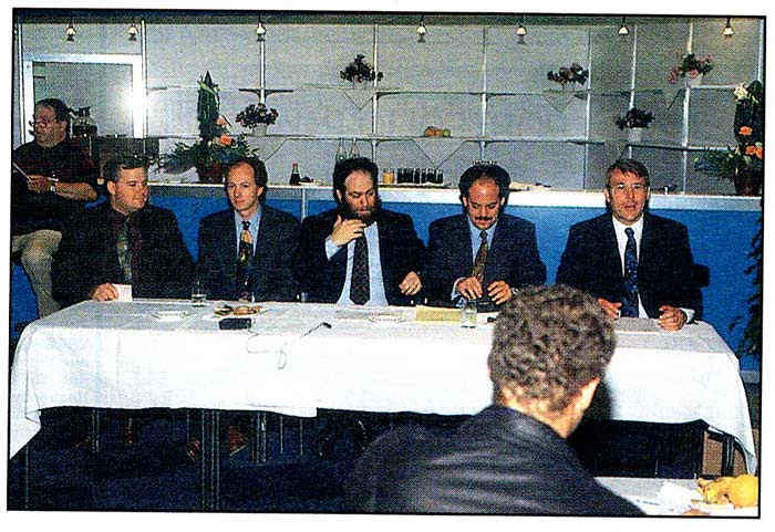 Man gab sich die Ehre bei der Pressekonferenz, von rechts nach links: Alwin Stumpf, Sam Tramiel, Leonard Tramiel, Richard Miller und Bill Rehbock.