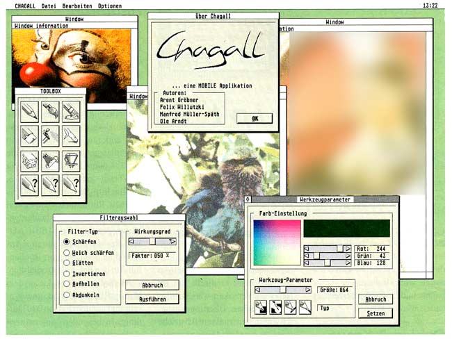 Nachdem Trade iT den Vertrieb des Repro Studios an die Entwicklerfirma Hofmann Engineering zurückgegeben hat, bietet man dort jetzt eine neue Bildverarbeitung namens Chagall an. Chagall ist modular aufgebaut und läuft auf allen Auflösungen mit bis zu 16,7 Mio. Farben, Grafikkarten und auch auf dem Falcon. Als Grafikformate sind TIFF, PCX, IMG usw. vorhanden. Scanner lassen sich über die GDPS-Schnittstelle ohne Probleme ansteuern. Die Ausgabe kann auf (Farb-)Drucker und Plotter erfolgen. Chagall verfügt über eine Vielzahl von Werkzeugen, die sich individuell in einer Box zusammenstellen lassen. Ferner bietet es die Möglichkeit der automatischen und manuellen Maskenerstellung. Sowohl Pixel- als auch Vektorgrafiken lassen sich mit Chagall erstellen. Beliebiges Zoomen, Drehen um hunderstel Grad und diverse Filter fehlen ebenfalls nicht.