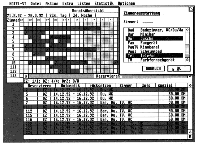 Ein Vektorgrafik-Illustrationsprogramm mit erstaunlichen Fähigkeiten konnte man am Stand von atelierdigital bewundern. Es ist für den professionellen Einsatz gedacht und setzt einen TT mit 8MB voraus. Zusätzlich wird eine Grafikkarte mit Farbbildschirm und ein Digitalisiertablett mit einer Folie mit Funktionsfeldern benötigt. Das Programm arbeitet mit zwei Bildschirmen (einer für die Werkzeuge und einer für die Darstellung). Zum schnelleren Arbeiten gibt es einen Modus, in dem nur die Umrisse der Objekte gezeichnet werden. Ansonsten lassen die Zeichenfunktionen kaum noch Wünsche offen, atelierdigital bietet einen direkten Zugriff auf 256 Farben aus einer Palette von 16,7 Mio. Mit Zustzmodulen lassen sich die Fähigkeiten des Programms noch weiter steigern. So gibt es ein Perspektivmodul zum perspektivischen Drehen und Verzerren, ein Chart- und Textmodul sowie diverse Ausgabemodule (EPS, TIFF etc.).