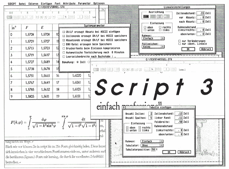 Von Purix wurde die Textverarbeitung Script3 gezeigt, die ab Dezember verfügbar sein soll. In der neuen Version finden sich eine Rahmenfunktion und eine automatische Tabellengenerierung, mit denen man leicht und schnell Übersichten erstellen kann. Häufig wiederkehrende Floskeln lassen sich als Textbausteine abspeichern und per Tastendruck aufrufen. Eine neue Wortkorrektur mit bis zu 10 verschiedenen Lexika und eine Indexerzeugung fehlen ebenfalls nicht. Neu sind auch die Rechenfelder und die automatische Textspeicherung. Script3 kann jetzt beim Ausdruck verkleinern, vergrößern und querausdrucken. Zusätzlich gibt es die Möglichkeit, in eine IMG-Datei zu drucken, und ein Faxtreiber sorgt dafür, daß man mit Q-FAX und Tele-Office Faxe verschicken kann.