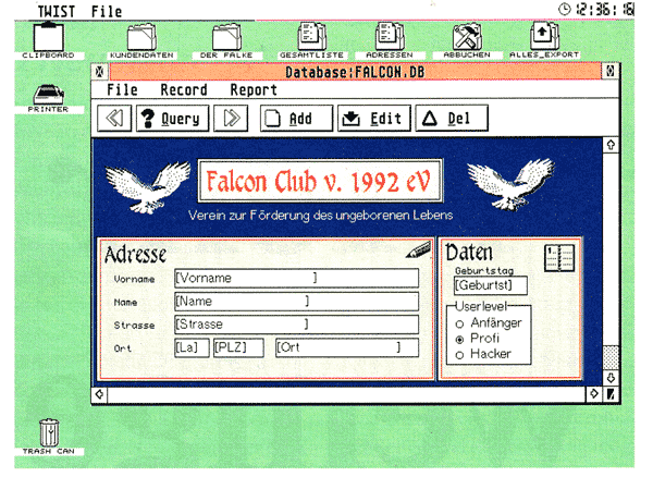 Auch an nützlichen Anwendungen wird es nicht mangeln. So konnte der interessierte Besucher bereits jetzt ein funktionierendes Harddisk-Recording System sehen und hören. Dieses wird noch wesentlich erweitert und zu einem kompletten Musik-Computersystem fürs heimische Wohnzimmer ausgebaut werden. Die Zukunft wird hier sicherlich noch viele weitere erstaunliche Anwendungsmöglichkeiten des Falcons zu Tage bringen. Es steht zu erwarten, daß der Falcon, wie damals 1985 der ST, eine Welle der „Programmierwut“ unter den Entwicklern auslösen wird.