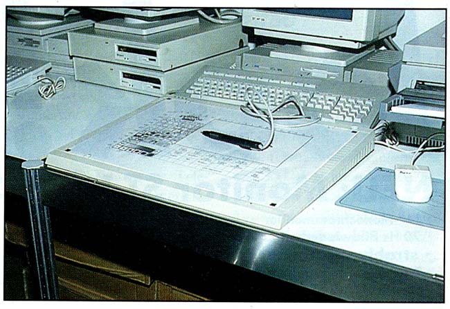Auch ein DIN-A3-Grafiktablett für ST/STE/TT konnte man am Stand sehen. Der Anschluß erfolgt über die serielle Schnittstelle. Es verfügt über einen Fadenkreuz-Cursor zum Konstruieren und einen Digitalisierstift zum Zeichen. Im Lieferumfang sind Universaltreiber für ReproStudio jr. und Avant Vektor, 3 Templates und ein Template-Editor enthalten.