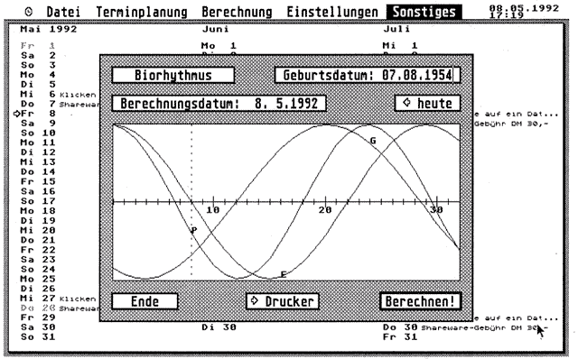 Biorhythmus: Die Idee der Biorhythmen geht von der Annahme aus, daĂ der Mensch verschiedenen Schwankungen unterliegt. Drei PeriodenlĂ€ufe in unterschiedlicher LĂ€nge fĂŒr Körper, Geist und Seele werden ausgehend vom Geburtstag bis zum aktuellen Datum in Sinuskurven grafisch dargestellt.