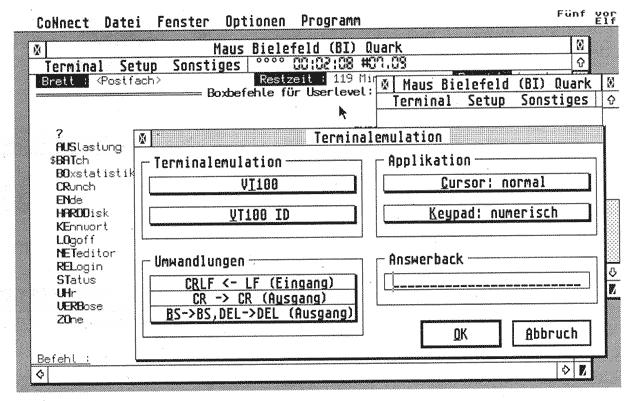 Die schier endlosen Möglichkeiten der individuellen Einstellung sind in einem Programmtest nur schwer aufzuzählen. Interessant ist aber in jedem Falle, daß CoNnect neben der üblichen VT52 oder VT100-Emulation die Terminals VT220 (7 und 8 Bit) und VT 102 unterstützt. Diese Emulationen sind insbesondere wichtig, wenn neben dem Kontakt zu einer Mailbox z.B. ein Großrechner an einer Universität angewählt wird. Hier versagen die anderen Terminalprogramme weitgehend ihren Dienst. Eine Verbindung ist aufgrund der unterschiedlichen Terminals mit CoNnect fast immer möglich, da auch eine automatische Identifizierung des Terminals auf Anfrage durch den anderen Rechner im Programm implementiert ist. Kurz, bezüglich der Terminalemulation bleiben bei CoNnect keine Wünsche offen.