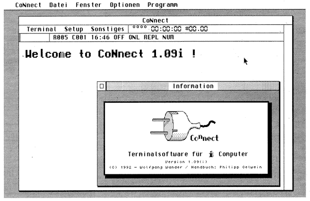Nun gesellt sich zu diesen beiden ein dritter, ambitionierter Bewerber um die Gunst der DFÜ-Süch-tigen. CoNnect von Wolfgang Wander, das inzwischen in der Version 1.09 i vorliegt, ist ein Shareware-Programm, das mit einem recht neuen Konzept aufwartet. Der Benutzer kann das Programm bis zu einem Monat ohne jede Einschränkung testen. Wenn es ihm zusagt, erwartet der Autor einen Obulus in Höhe von 50,- DM.