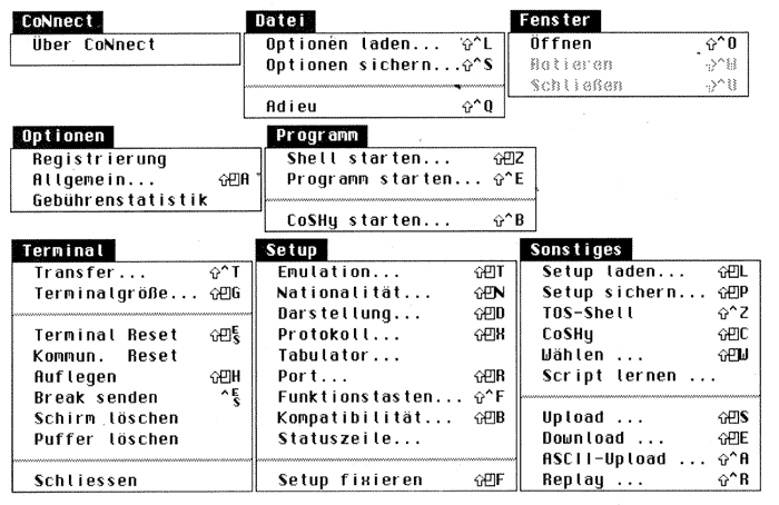 Die vieldiskutierte intuitive Bedienung eines Programms, also das Vorhandensein der "Bedienungselemente in verschiedenen Programmen an der gleichen Stelle, wird nicht gerade dadurch unterstützt, daß an Stellen, an denen der Benutzer nicht unbedingt damit rechnet, Menüleisten erscheinen. Im Falle von CoNnect läßt sich das Fenstermenü zwar durch die Option, mehrere Terminalfenster mit unterschiedlichen Parametern gleichzeitig zu betreiben, begründen. Jedoch sollte ein Programmautor wirklich nur im Notfall zu unkonventionellen Bedienungsmöglichkeiten greifen. Eine andere Lösung wäre daher auch im Falle von CoNnect wünschenswert.