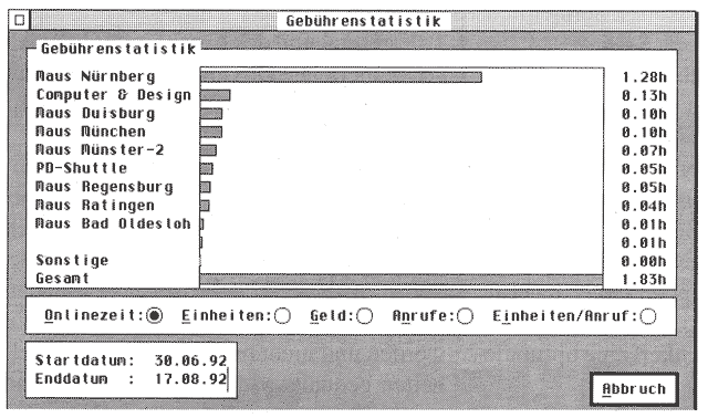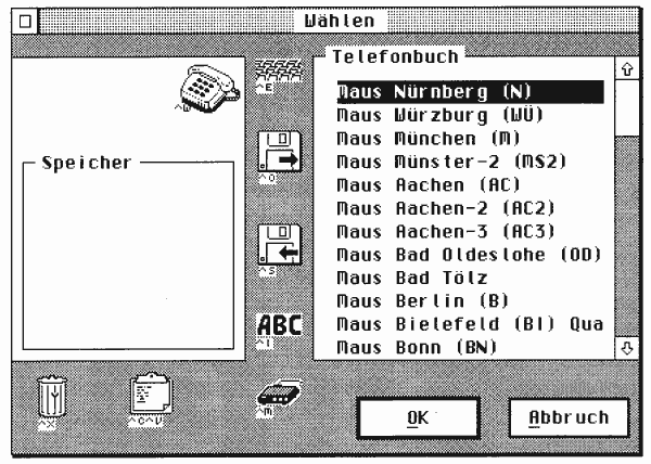 Die Anwahl selbst zeigt sich sehr komfortabel. In einem eigenen Fenster kann die Mailbox, mit der man in Kontakt treten möchte, auf das stilisierte Telefon gezogen werden - schon beginnt das Modem zu wählen. Eine im Programm enthaltene und erweiterbare Nummernliste läßt die Anwahl aller Mäuse und deren Ableger, der Quarks, zu. Ist man erst einmal verbunden, hält sich das Terminalprogramm angenehm zurück. Es erledigt alle anfallenden Geschäfte zuverlässig; Bedienungen des Programms sind, außer zur Auswahl der Up- und Download Pfade, während der Datenübertragung unnötig. Zur Hilfestellung von Modems, die Probleme mit der Erkennung des Verbindungsendes haben, ist auch ein manuelles Auflegen möglich. Wahlwiederholung und automatische Baudrateneinstellung sind selbstverständlich. Als äußerst komfortabel erweist sich der eingebaute Gebührenrechner, durch den man die „verballerten“ Einheiten stets schmerzlich vor Augen hat. Die individuelle Einstellung der erreichbaren Regional-, Nah- und Fernzonen gestaltet sich durch Eintrag in eine Datei einfach. Die Vorwahlnummern des bei jedem Postamt erhältlichen AVON werden in eine für CoNnect verständliche Form gebracht. CoNnect erkennt nun selbständig, ob mit dem Modem von nebenan oder mit Sunnyvale, Kalifornien. telefoniert wird. Die Einheiten werden korrekt als Geldbetrag und Einheit im Terminalfenster dargestellt. Gegen Ende der Einheit kann zusätzlich ein Signalton ausgegeben werden, um die Dauer eines Gespräches ökonomisch einzuteilen.