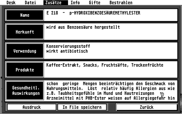 Bei der Ausgabe auf den Bildschirm erfahren Sie die E-Nummern, den vollen Namen dieses Stoffes, die Art, wie er gewonnen bzw. hergestellt wird, und den Zweck, zu dem er einem Lebensmittel zugesetzt ist. Ferner werden Ihnen ein paar typische Produkte genannt, in denen dieser Zusatzstoff häufig verwendet wird, und schließlich erfahren Sie. ober nach derzeitiger Erkenntnis ein gesundheitliches Risiko birgt.