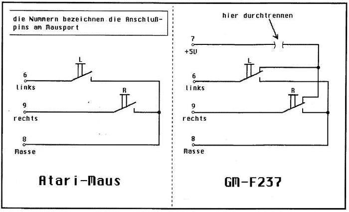 Nun aber zur Behebung des Joystick-Konflikts. In der original Atari-Maus schalten die Maustasten die Leitungen Feuerknopf/linke Maustaste bzw. Feuerknopf1/rechte Maustaste auf Masse (Abbildung 2). Im Ruhezustand werden die Leitungen nicht beschaltet. Das reicht auch völlig aus, da TTL-Bausteine einen unbeschalteten Eingang als logisch high auswerten. In der Genius-Maus werden die Tasten im Ruhezustand jedoch mit +5V belegt. Da die Leitung für die rechte Maustaste mit der des Feuerknopfes beim Joystick verbunden ist, muß zwangsläufig ein Kurzschluß entstehen wenn der Feuerknopf gedrückt und die Leitung damit auf Masse gelegt wird. Man muß also auf der Mausplatine die Leiterbahn zwischen den Ruhekontakten der Taster und +5V durchtrennen.