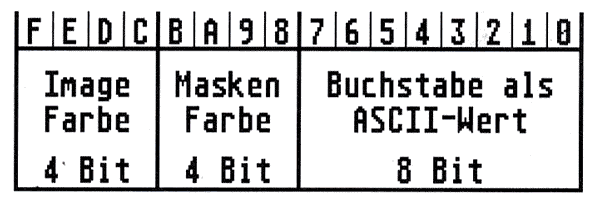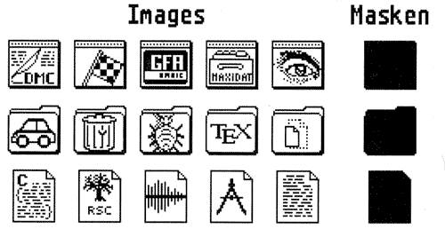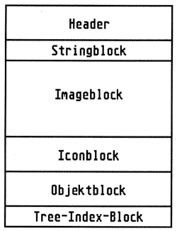 In den Icon-Blöcken von je 34 Byte sind die Pointer auf Image, Masken und Text untergebracht. Der ,Text‘-Pointer zeigt hierbei auf eine Zeichenfolge im String-Block. Der String-Block wiederum besteht aus einer Anzahl von Zeichenketten, welche nach C-Konvention durch Bytes mit dem Wert Null getrennt sind. Des weiteren sind in den Icon-Blöcken die Farben von Image und Maske, der Buchstabe im Icon und dessen Lage sowie die Größe des Icons in Pixeln zu finden.