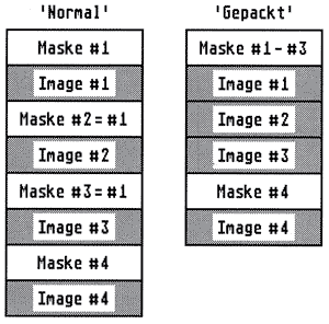 Es gibt viele Icons, bei denen sich zwar die Images unterscheiden, aber die Masken identisch sind. Ein Beispiel hierfür sind Programm-Icons, die alle den gleichen Umriß haben und sich nur im Innern unterscheiden. Ein RCS speichert aber alle Masken separat ab, auch wenn sie gleich sind, also z.B. für 11 Icons sind dies 11 Images und 11 Masken. Durch die Verwendung von Pointern auf die Daten für Image und Maske in der Icon-Block-Struktur ist es aber durchaus möglich, vollständig gleiche Masken wegzulassen. Kommen z.B. in einer Resource 3 Icons vor, die die gleiche Maske besitzen, so soll diese Maske nur einmal gespeichert werden. Die Pointer dieser 3 Icons zeigen dann zwar auf verschiedene Image-Daten, aber auf dieselbe Maske. Mit diesem Verfahren kann man genügend Platz in einer Resource-Datei sparen, um mehr Icons darin unterzubringen. Bei Verwendung von nur einer Maske könnte man so 351 Icons in eine Resource-Datei packen.