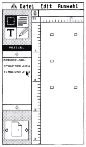 Nach dem einigermaßen gründlichen Studium des übrigens gut gegliederten und sehr übersichtlichen Handbuches geht es los. Am besten wird es sein, wenn wir mal den Aufbau einer Seite an einem Beispiel bis ins Detail erläutern. Wir hatten uns vorgenommen, einen etwas größeren Text 2spaltig zu setzen und ein oder zwei Grafiken einzubinden. Wie schon erwähnt, ist es recht problemlos, einen Rahmen aufzuziehen. Als Anhaltspunkt dient dabei ein sogenanntes Formatblatt, daß man auf seine eigenen Bedürfnisse anpassen und gestalten kann.