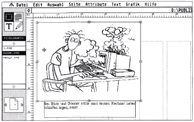 Der Einsatz von Grafikkarten klappte nicht. GST hat anscheinend nicht darüber nachgedacht, daß es auf dem deutschen Markt mittlerweile auch für den ST Grafikkarten gibt, die von den alten ST-Auflösungen zum Teil drastisch abweichen. Da liegen bei einem DTPler die Nerven blank, wenn er auf einem großen MATRIX-Farbsystem statt Timeworks Publisher nur Bomben bekommt. Es verlangt ja niemand, daß das Programm auch Farbe kann, aber es könnte wenigstens auf einer Monochromemulation laufen. Etwas krass war auch die Funktion, mit der man einen Rahmen löscht. Einfach den Rahmen aktivieren und DELETE drücken - der Rahmen verschwindet dann kommentarlos.